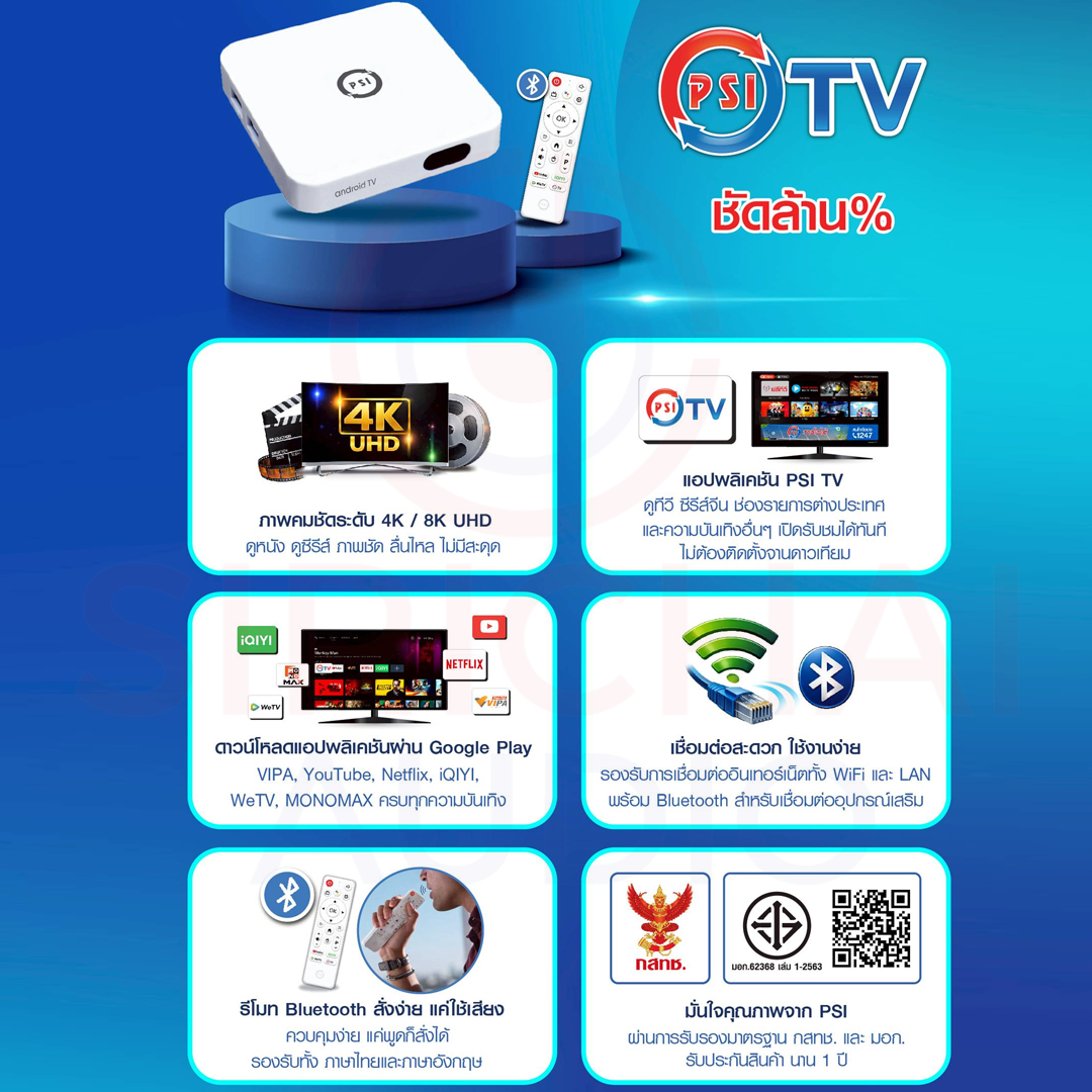 PSI TV คือ กล่อง Android TV ที่ช่วยเปลี่ยนทีวีธรรมดาให้กลายเป็นสมาร์ททีวี สามารถเข้าถึงแอปและดาวน์โหลดแอปใน Google Play ที่มาพร้อมเทคโนโลยีการสั่งงานด้วยเสียงทั้งภาษาไทยและอังกฤษ ใช้งานง่าย เชื่อมต่อสะดวก รับชมรายการทีวีได้โดยไม่ต้องใช้จานดาวเทียม สัมผัสประสบการณ์ความบันเทิงระดับพรีเมี่ยม พร้อมเปิดโลกความบันเทิงแบบไร้ขีดจำกัด