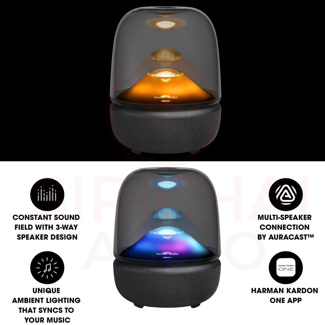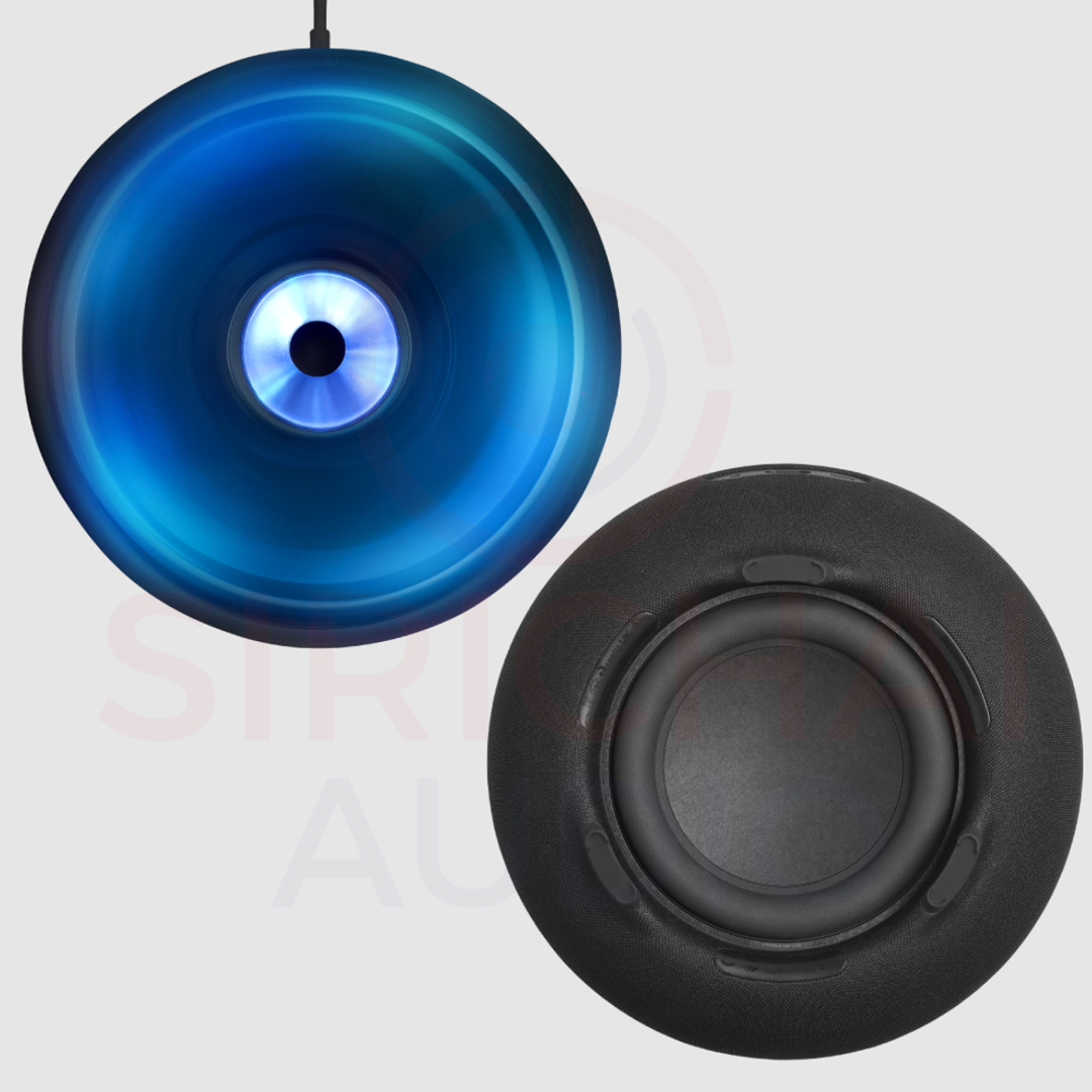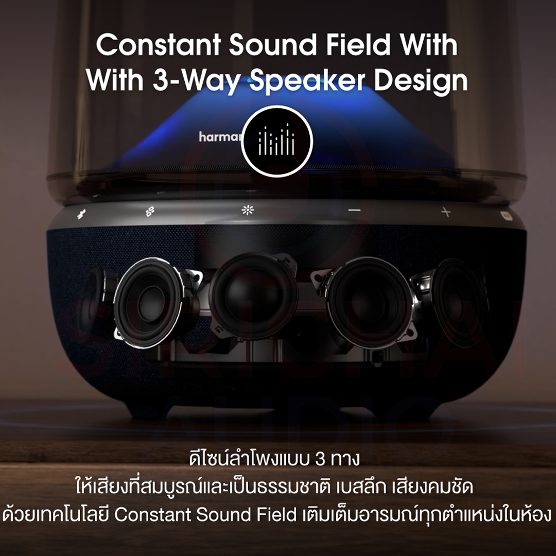 มิติใหม่ของแสงไฟ Aura Studio 5 มาพร้อมแสงไฟรอบทิศทาง 360° ที่พัฒนาด้วยเลนส์กระจายแสงใหม่ สร้างลวดลายไดนามิกสวยงาม ช่วยเติมบรรยากาศให้ดื่มด่ำยิ่งขึ้น และยังปรับสีรวมถึงรูปแบบแสงได้ตามสไตล์คุณผ่านแอป Harman Kardon One
